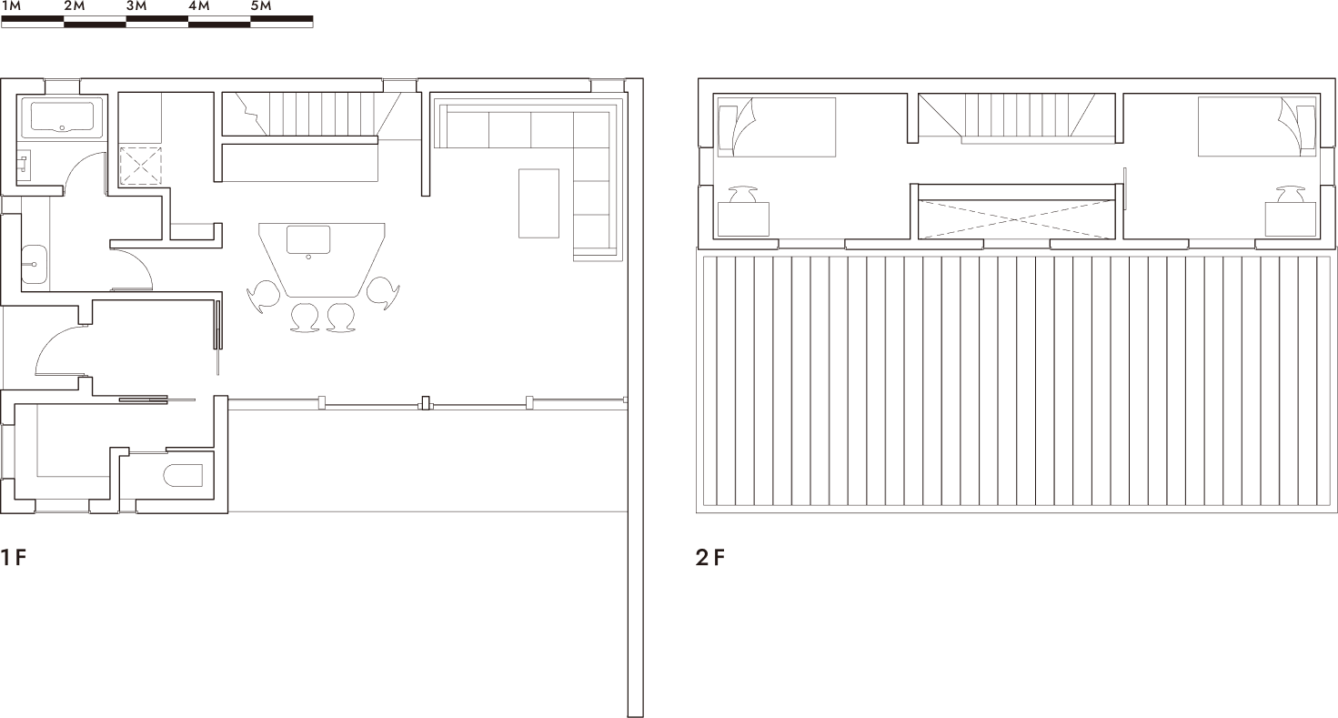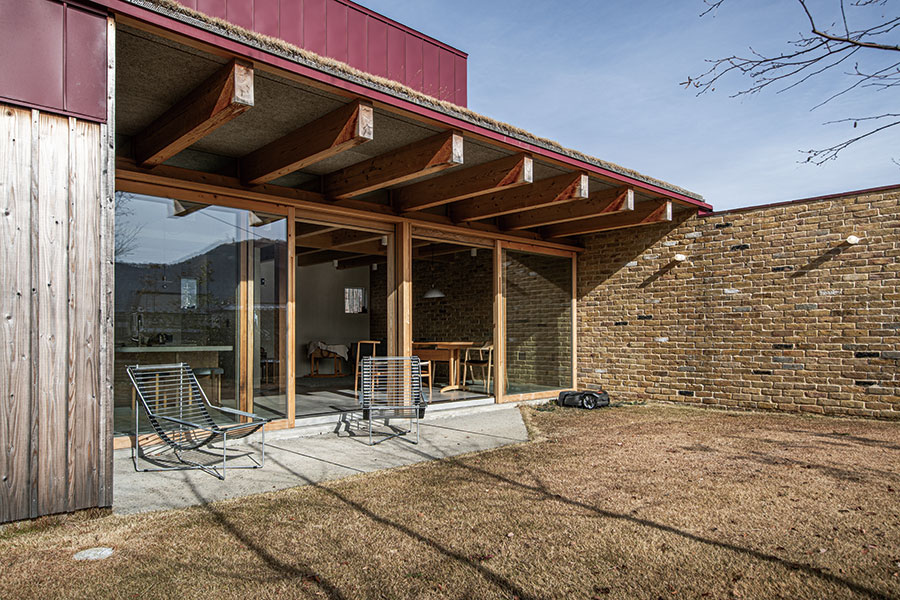 2つの全く異なる素材で彩られた家、GRENZEN(境界線)。特徴的ながらも、自然豊かな風景に溶け込むように、プロポーション、素材感、色味の全てが洗練されている。土間仕上げのLDKスペースからは、ブリックタイルの壁、磨き材の梁、そして床面までもが開口面を突き抜けて庭先へと連続している。それが家の内外の差を曖昧にし、坪数以上の空間的拡がりを生み出している。ミニマルな構成の階上は、どちらの窓からも緑をたたえる草屋根が視界一杯に広がり、まるで借景の様に、遠くに広がる自然の景色を、家の中まで引きこんでくれる。心理的境界線を、建築的意匠によって巧みに操作している、菱田工務店のフラグシップ。※規格住宅ではありません