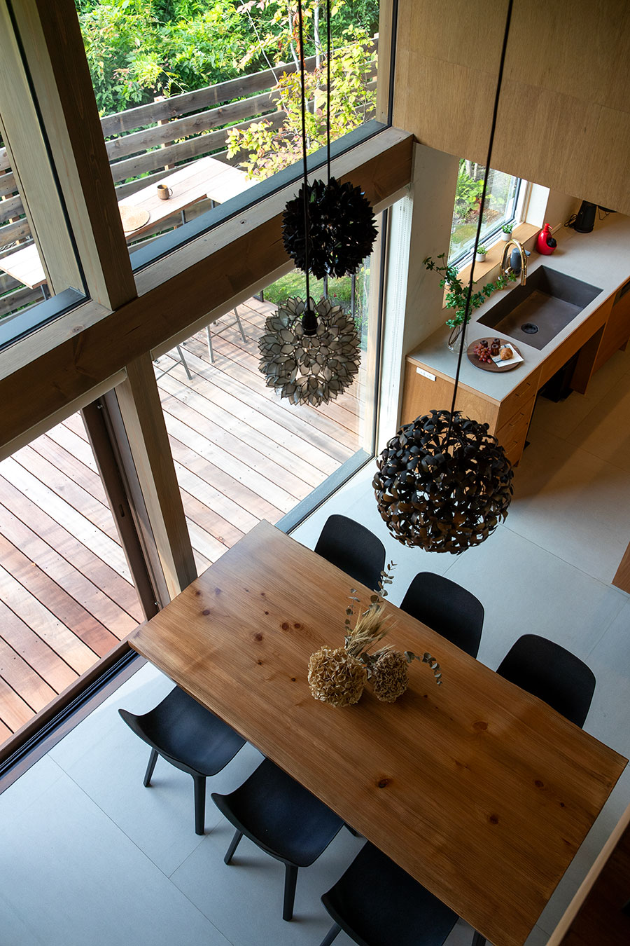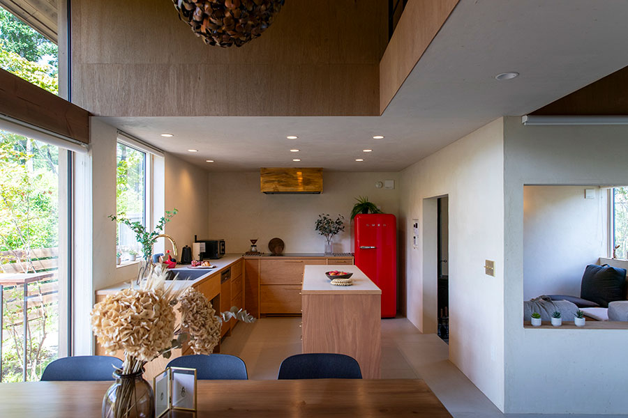 コテージを意味するHUISJE。落ち着きのあるシンプルな外観をした宝箱。その中には幾つもの「間」が組み込まれている。あたたかな木肌で包まれた開放感のある吹き抜けダイニング。薪ストーブの炎を楽しみながらこもれるヌック。ふと動きをとめ、家族の様子を眺めたくなるブリッジ。只々オープンなプランでは味わう事の出来ない多種多様な「居場所」が、家の至るところに生まれている。窓の向こうにひろがるお庭と、そこに根付いていく四季が空間構成に参加するとき、どれだけ過ごしても飽きのこない、素敵なHUISJEが出来上がる。